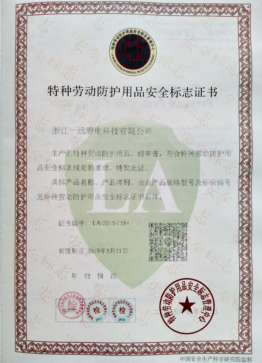 ? ? ? 隨后兩位老師隨機(jī)抽取防靜電服、防靜電鞋樣品進(jìn)行封存,我公司隨后寄往國(guó)家安全生產(chǎn)(武漢)勞動(dòng)防護(hù)用品檢測(cè)中心進(jìn)行產(chǎn)品檢測(cè),近一個(gè)月的檢測(cè)周期結(jié)束后,浙江一遠(yuǎn)靜電公司的防靜電服、防靜電鞋產(chǎn)品檢測(cè)全部合格,順利通過(guò)了產(chǎn)品抽檢,于5月12日收到了北京勞安中心寄來(lái)的《特種勞動(dòng)防護(hù)用品安全標(biāo)志》的證書(shū)。