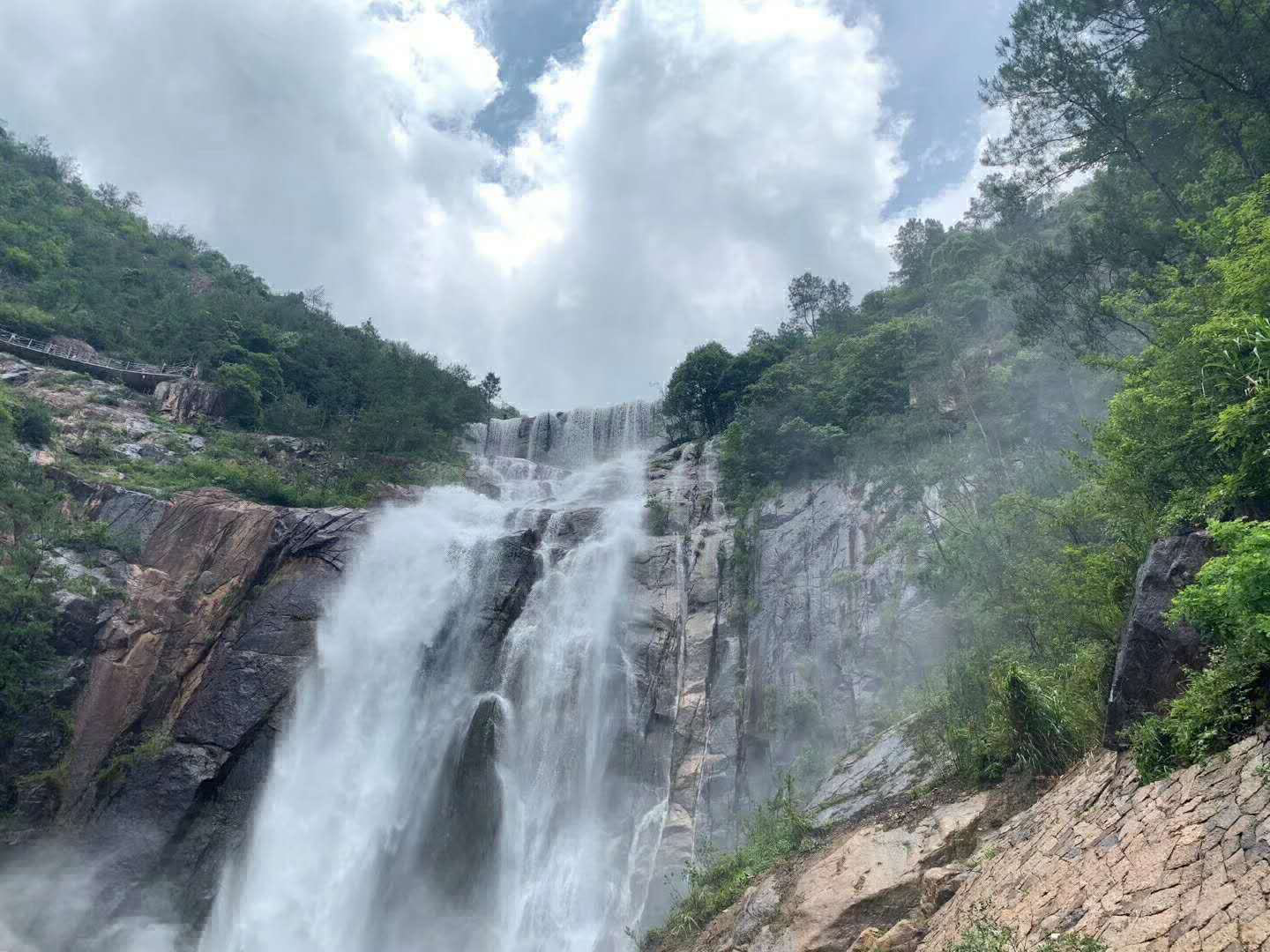 ? ? ? 中午時刻,大家品嘗當(dāng)?shù)匦迈r、美味的農(nóng)家飯,簡單而具有特色。飯后,我們繼續(xù)出發(fā)至第二個景點(diǎn)——天臺山大瀑布。進(jìn)入景區(qū),遠(yuǎn)遠(yuǎn)望去,只見瀑布像銀河下瀉,在山腳激起千波萬浪,水霧蒙蒙。大家都被眼前美麗宏觀的景象所震撼。一千多年前就聞名于世的天臺山大瀑布,斷流六十年后,震撼重現(xiàn),猶如一條白色的巨龍,在群山間翻騰,渲染著天臺山的山水畫卷。天臺山大瀑布原名桐柏瀑布、又名三井瀑布,高325米,最寬90米,堪稱中華第一高瀑?!俺喑窍计鸲?biāo),瀑布飛流以界道”。瀑布流態(tài)千姿百態(tài)。遠(yuǎn)眺是完整的單體大瀑布,近觀是個流態(tài)各異的九級瀑布群。大家沿路可親水、可嬉水,在九級瀑布間穿插前行。大家結(jié)伴同行賞瀑布,置身于秀美山水之間,使人悠然自得,心曠神怡。漂亮的景色讓大家流連忘返,禁不住用相機(jī)記住每一個精彩美麗的瞬間!