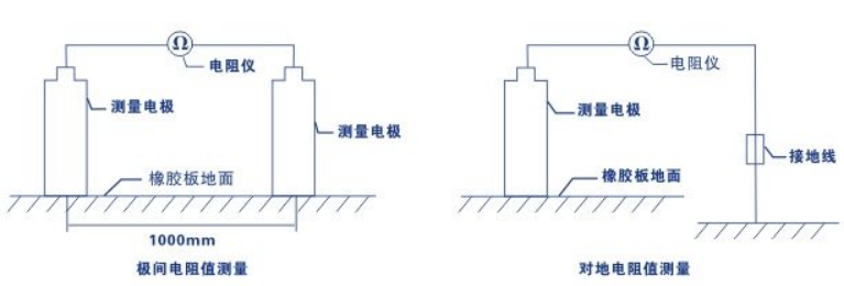 測(cè)量?jī)x器為絕緣電阻測(cè)試儀,直流開(kāi)路電壓500V,短路電流5mA。測(cè)量電極用銅或不銹鋼材料制作成圓柱狀標(biāo)準(zhǔn)電極,直徑60±2mm,重量2±0.2千克,測(cè)量電極必須防氧化處理。 1、在地面放置兩個(gè)相距1m的測(cè)量電極,將儀表兩接線端子分別與電極相連,測(cè)極間電阻值; 2、在地面放置一個(gè)測(cè)量電極,將儀表一接線端與電極相連,另一接線端接至工房和庫(kù)房接地網(wǎng)上(如無(wú)接地網(wǎng),可接至充水的自來(lái)水管上),測(cè)該點(diǎn)對(duì)地電阻值; 3、每個(gè)工房和庫(kù)房至少選5個(gè)測(cè)點(diǎn),測(cè)點(diǎn)應(yīng)選在生產(chǎn)工人操作和經(jīng)常走動(dòng)的地方,并要求距接地體1m以外; 4、不論是極間電阻值還是極地電阻值,均取算術(shù)平均值; 5、導(dǎo)靜電橡膠板地面電阻值為≤5X104Ω或5X104-106Ω;防靜電橡膠板地面電阻值應(yīng)在106Ω-109Ω范圍內(nèi)。 |