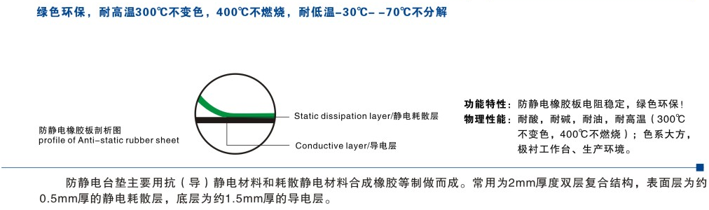 技術(shù)參數(shù) ? ? ? ? ? ? ? ? ? ?  ? ? ? ? ? ? ? ? ? ? ? ? ? ? ? ? ? ? ? ? ? ? ?? 表面電阻 | 106-109Ω | 底面電阻 | 103-105Ω | 體積電阻 | 105-108Ω | 硬度 | 70-75 | 磨耗率 | < 0.02g/cm2 | 散電散除時(shí)間 | < 0.1s |